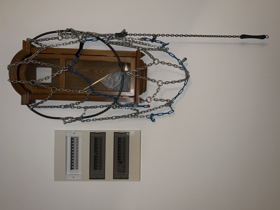 The image depicts an interior scene in Sutomore, Montenegro, featuring a plain white wall. On the left, a beige electrical distribution panel is vertically mounted, containing three tiers of circuit breakers; the top tier shows 10 red-marked breakers, the middle tier 10 grey breakers, and the bottom tier 7 grey breakers, all appearing in the "on" position. To the right, a wooden grandfather clock housing, dark brown with a glass front, is mounted on the wall. The clock's internal mechanism is absent. Inside the housing, a white plastic bag and a light-colored stick are visible. A large, black, circular metal hoop surrounds the clock housing. Numerous metal chains, varying in color (silver and blue) and link type, are draped over and around the clock housing and the black hoop. Several hooks and at least one small, silver padlock are interspersed within the chains. A single black chain with a black rubberized handle hangs vertically from the lower right side of the chained assembly. No individuals are present in the scene.