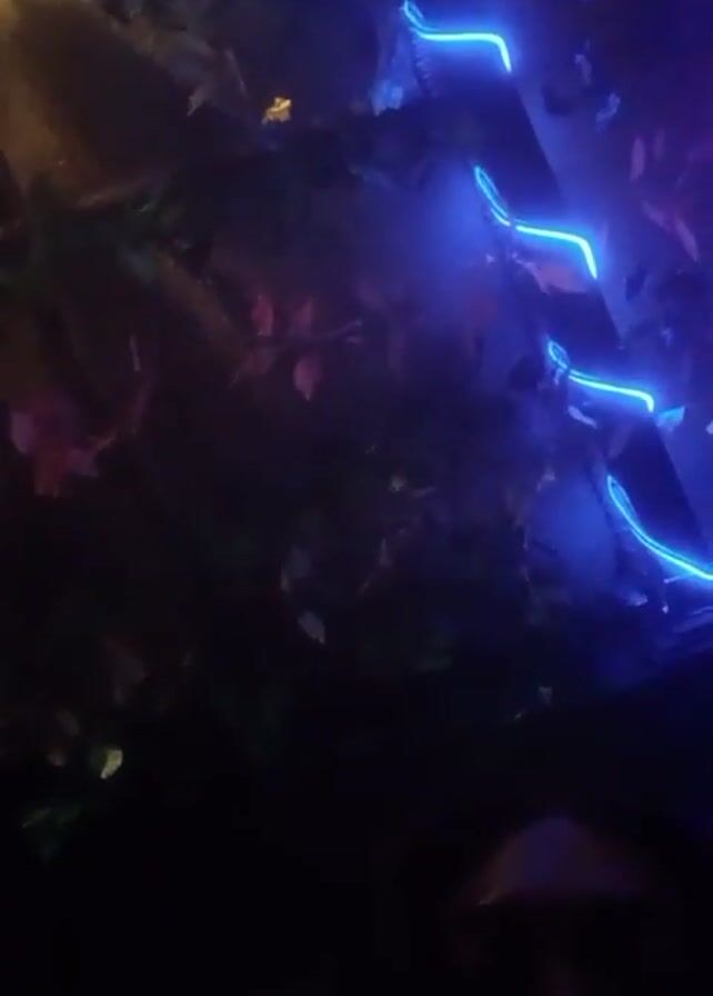 close-up, slightly angled view of a set of stairs decorated with blue LED lights. The lights are arranged in short, curved segments along the edges of the steps. The surrounding area is dark, but glimpses of foliage, including leaves and artificial plants, are visible around the stairs. The lighting changes color, cycling through green and red tones. A person's face is partially visible at the bottom of the frame, but is mostly obscured in shadow. The audio suggests the video was taken in a lively environment, as music plays in the background.