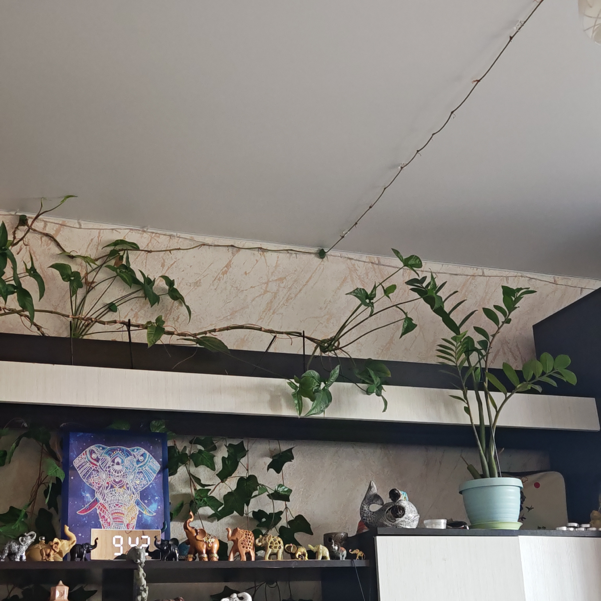 room interior. A shelf is visible, filled with various decorative objects, including multiple small elephant figurines and a picture of an elephant. A digital clock displays "9:42". A potted plant with green leaves is present on the right side of the shelf. Vines with green leaves run along the shelf and extend towards the ceiling. A thin cord or wire is also visible on the ceiling. The location is unknown, and the city of Ketoshi, Russia cannot be confirmed from the visual information.