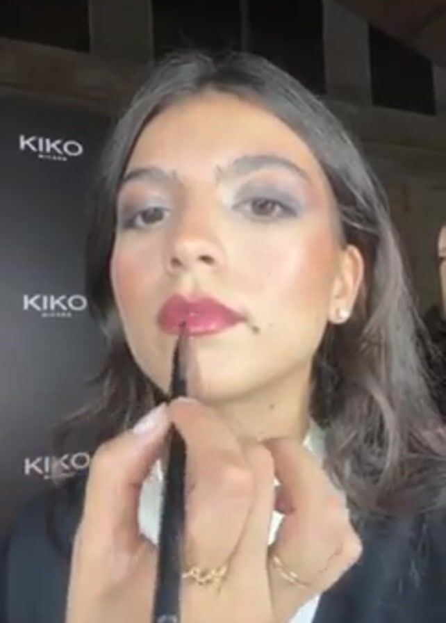 A young woman with light brown skin and long brown hair applies dark pink lipstick to her lips with a brush. She is wearing a black jacket, a white collared shirt, and multiple rings on her fingers. Behind her is a black backdrop with the white "KIKO MILANO" logo. The lighting is bright.