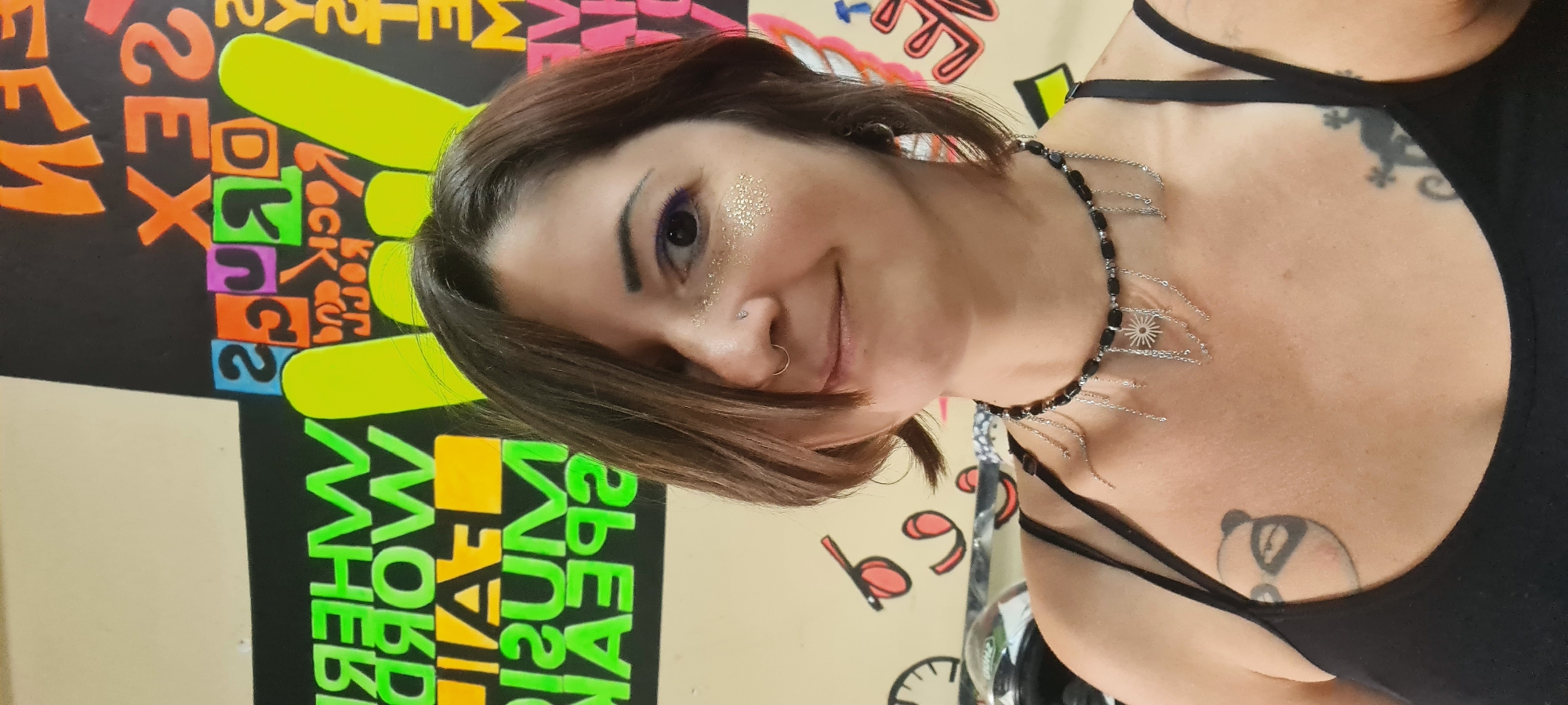 A woman with glitter on her face and a nose ring is looking at the camera. She is wearing a black top and a beaded necklace with silver chains. Two tattoos are visible on her chest: a lizard and a panda. Behind her is a colorful wall with graffiti-style lettering and a large yellow peace sign. The words "rock" and "SEX" are prominent in the background.