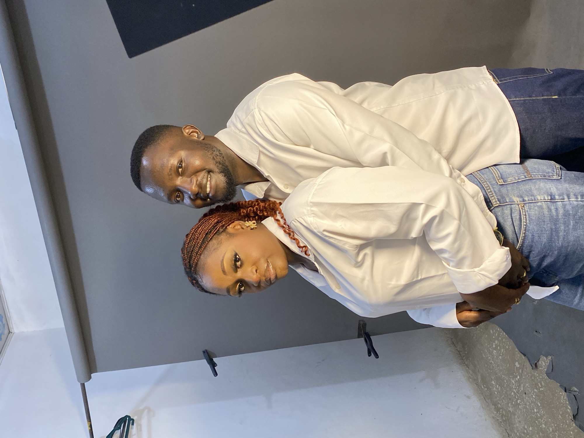 Two individuals, one male and one female, are posed for a photograph in what appears to be an indoor photography studio