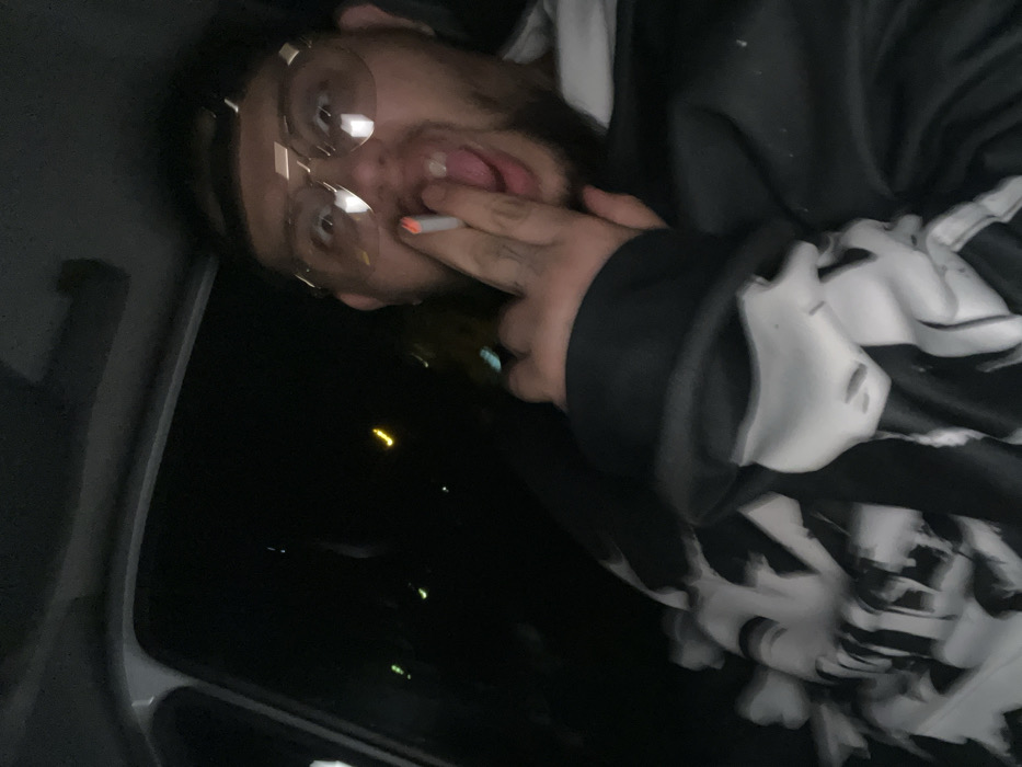 The image depicts a male subject inside a vehicle, likely in the passenger seat, at night in Sofia, Bulgaria. The subject, with facial hair and dark hair, wears oversized, light-tinted aviator-style glasses and a black garment featuring a white skull or skeleton pattern. He holds a lit cigarette between the index and middle fingers of his right hand, the tip of which is glowing. His face exhibits an exaggerated expression with wide eyes and a widely opened mouth revealing his tongue. Blurred external lights are visible through the vehicle's window on the left side of the frame, indicating an outdoor, low-light environment.