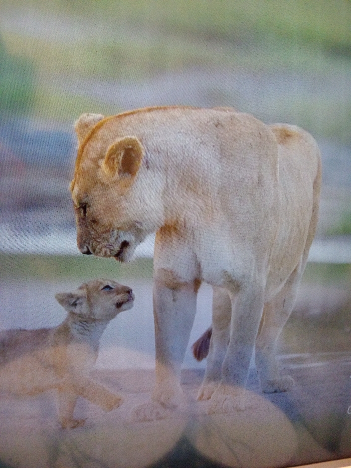 - "An adult lioness and a young lion cub are situated on light-colored, sandy ground within the city of Ijoko, Nigeria" by FM-FBtc13, licensed under CC BY 4.0