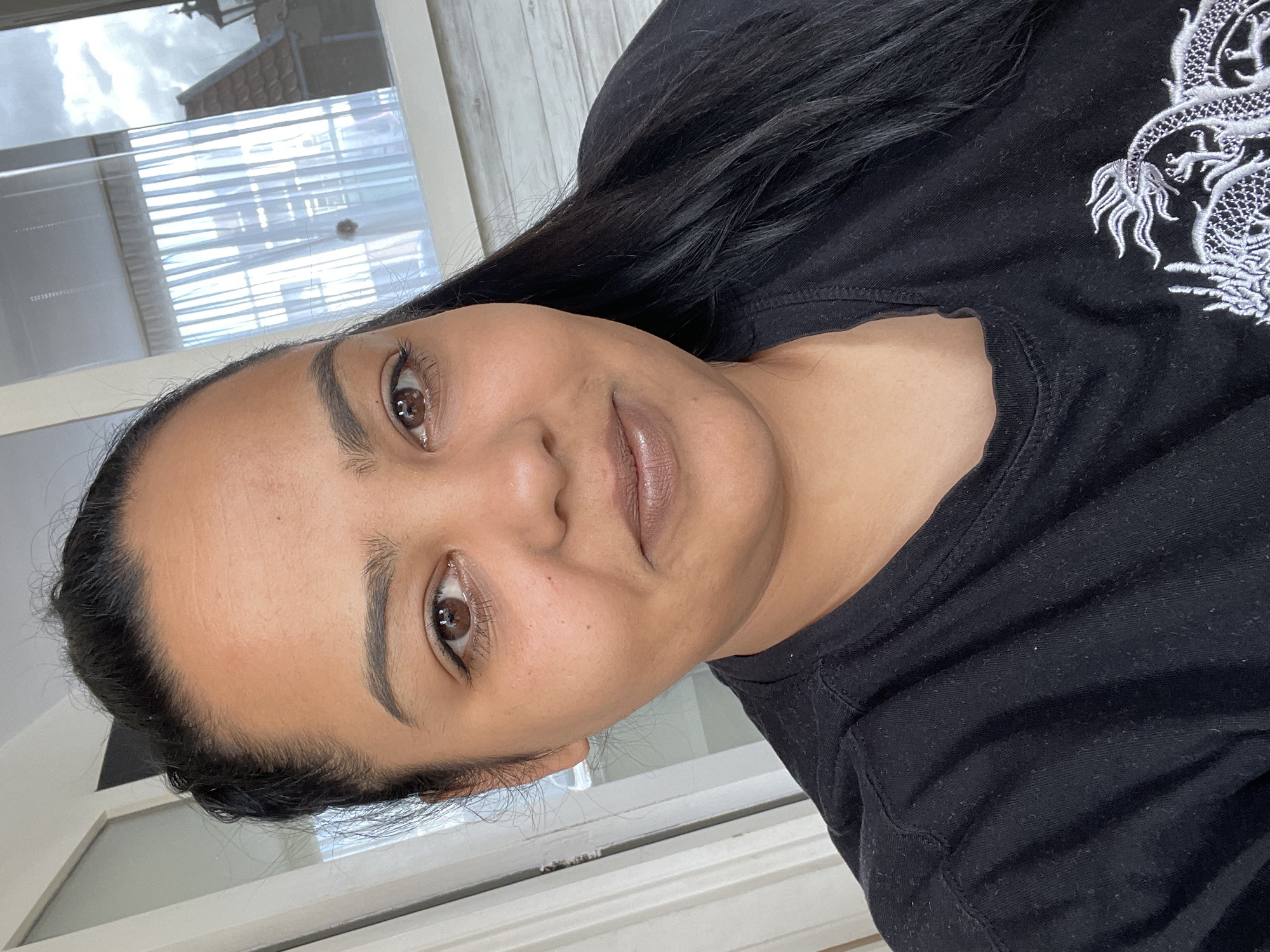 A woman with dark hair is facing the camera. She has brown eyes, dark eyebrows, and light brown lipstick. She is wearing a black T-shirt with a white dragon design on the upper right side. She appears to be indoors, near a white door frame with a window or blinds behind her. There is not enough information to identify the location in Dronten, Netherlands.