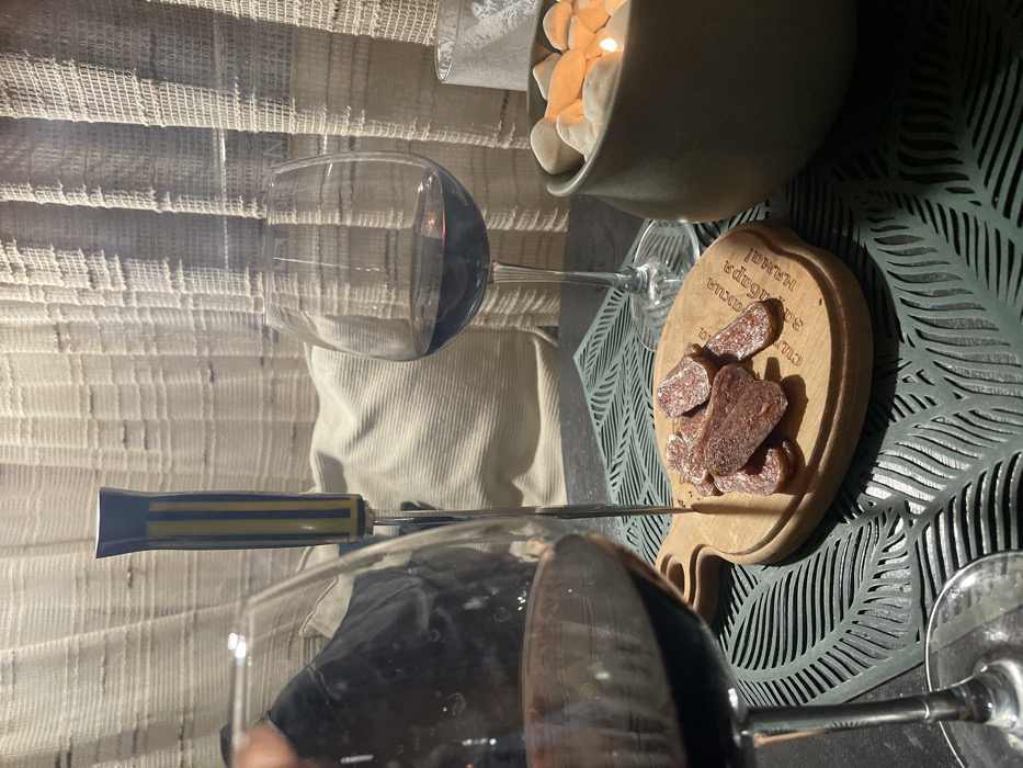 The scene depicts an indoor table setting in Stoletovo, Bulgaria, under subdued lighting. A dark table surface is partially covered by a dark teal placemat featuring a raised, leaf-like pattern. Positioned on the placemat, a small, irregularly shaped light-wood cutting board holds approximately ten slices of reddish-brown cured meat. A metallic fondue fork, distinguished by its blue and yellow striped handle, is vertically inserted into one of the meat slices on the board. Inscribed Cyrillic text is visible on the board's surface. To the right, a sage-green ceramic pot contains a lit candle surrounded by several off-white, irregular stones. Two stemmed wine glasses are present; one in the immediate foreground, partially cropped on the left, holds red wine and displays a reflection of a human hand. The second wine glass, also containing red wine, stands further back on the right. The background features light-colored, textured curtains, behind which a light-toned, ribbed cushion or pillow is visible.