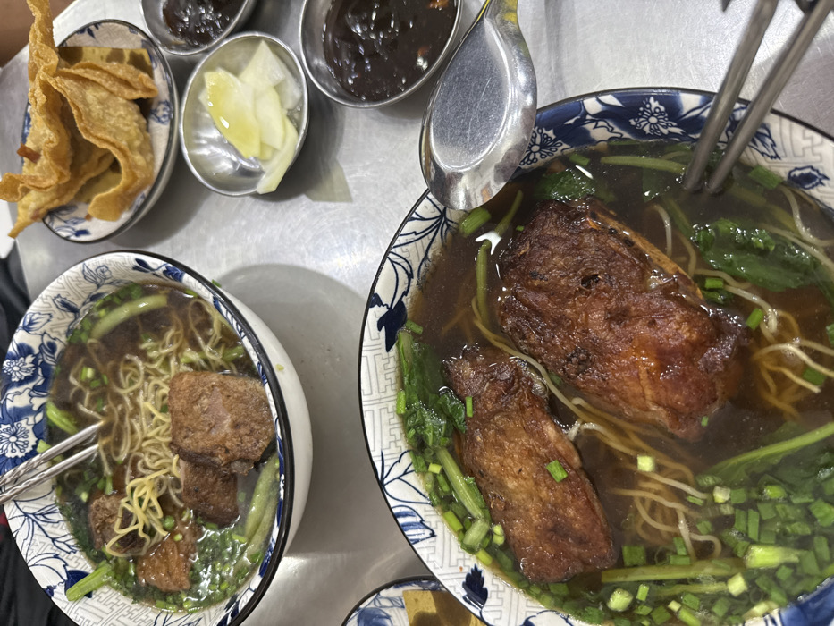 The image depicts a close-up, overhead view of a dining table in a casual eatery, consistent with a setting in Ho Chi Minh City, Vietnam. The table surface is brushed metal. The primary subjects are two bowls of noodle soup and accompanying side dishes. The upper bowl, a white ceramic bowl with a blue floral pattern, contains yellow wavy noodles, dark broth, green leafy vegetables, chopped green onions, and several large, brown, irregularly shaped pieces of stewed or braised meat. A pair of metal chopsticks rests within this bowl. The lower bowl, partially cropped and identical in pattern, contains thinner, lighter-colored noodles, dark broth, green leafy vegetables, chopped green onions, and two prominent, large, dark brown, possibly fried or braised pieces of meat. A metal spoon and chopsticks are positioned near the rim of this bowl. To the right of the main bowls, several smaller dishes are arranged: * A small white ceramic bowl with a blue pattern holds several golden-brown, crispy fried wonton wrappers. * A small silver metal dish contains sliced light-colored pickled vegetables, likely daikon or radish. * Two small silver metal dishes contain dark, thick dipping sauces. * A small white plate with a yellow, possibly fried, food item is partially visible on the far left. No individuals are visible, but the arrangement of food and utensils suggests active dining.