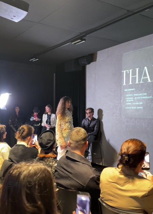 fashion show, likely a finale or presentation of a collection. Several seated attendees, primarily viewed from behind, are taking photos or videos with their smartphones. Two models are walking on a small stage in front of the seated audience. They are wearing distinctive, textured outfits in light neutral colors. Behind the models, there's a projection screen displaying the word "THANK" and contact information, suggesting the show's conclusion. To the left of the screen, a woman is standing near a podium. A man is seated on a stool near the screen. The room has dim lighting and dark walls. A projector is mounted on the ceiling, and there's a studio light to the left of the stage.