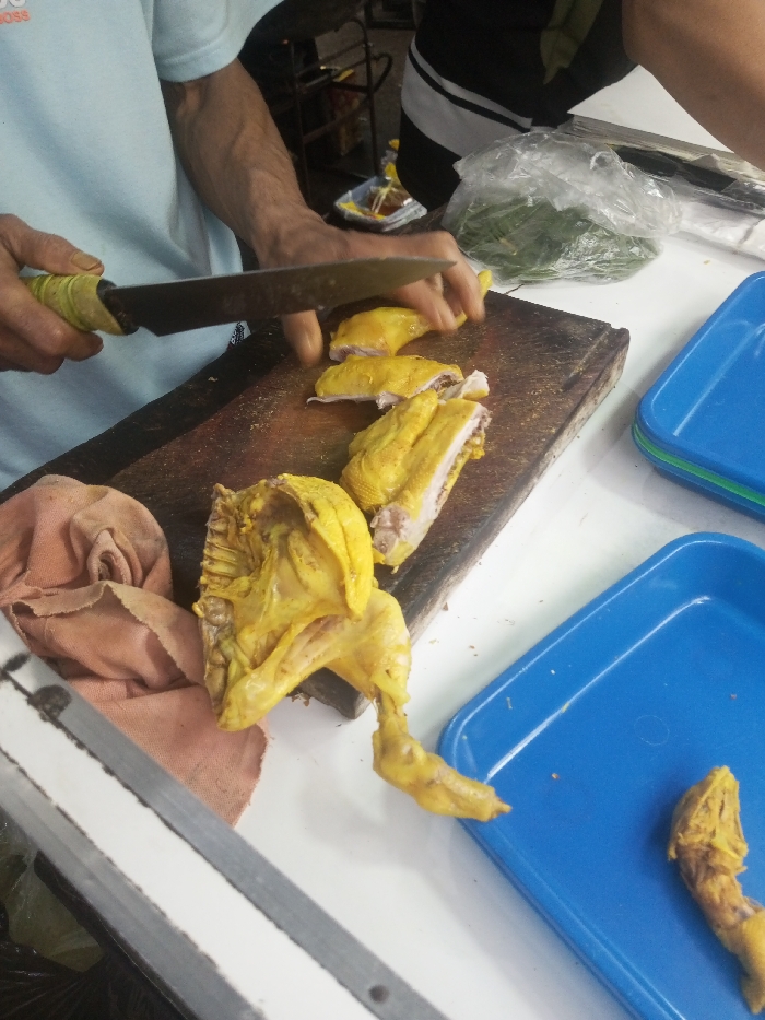 The scene depicts a food preparation area in the city of Tangsibi, Bhutan. A person, whose upper torso and arms are visible, is dismembering a cooked, yellow-skinned chicken on a dark, rectangular wooden cutting board. The individual's left hand, with visible veins and wearing a light blue short-sleeved shirt, grips a knife with a dark blade and a light green wrapped handle. Their right hand stabilizes the chicken on the cutting board. Several pieces of the cooked chicken, including cut sections of breast and thigh, are present on the board. A larger, partially intact section of the chicken, including part of the rib cage and a leg, rests to the lower left on the board. To the far left, a crumpled, light brown textile is placed on a white countertop. On the white countertop to the right, a clear plastic bag filled with green leafy vegetables is visible. Below it, two stacked bright blue rectangular plastic trays are present; a single piece of chicken, possibly a leg or foot, lies in the top tray. A third, possibly green, tray is visible beneath the top blue one. In the upper right background, part of a second person wearing a black and white striped garment is partially visible. The overall setting appears to be an indoor space, likely a market stall or kitchen.