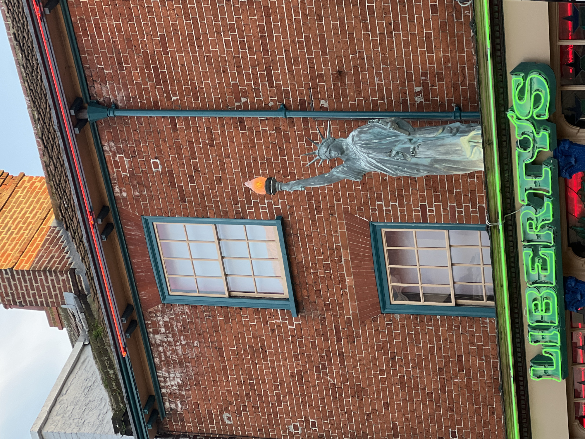 The image is of a brick building with a green gutter. There are two windows with a blue-green trim, and the statue of liberty above the windows. There is a bright green neon sign spelling "LIBERTY'S" on the right side of the image. The location is in the city of Great Yarmouth, United Kingdom.