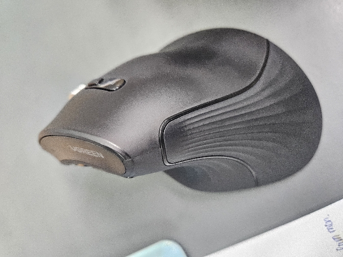 - "black vertical ergonomic computer mouse with a textured surface and the inscription "AGREEEN" on the side" by FM-O3aH92, licensed under CC BY 4.0