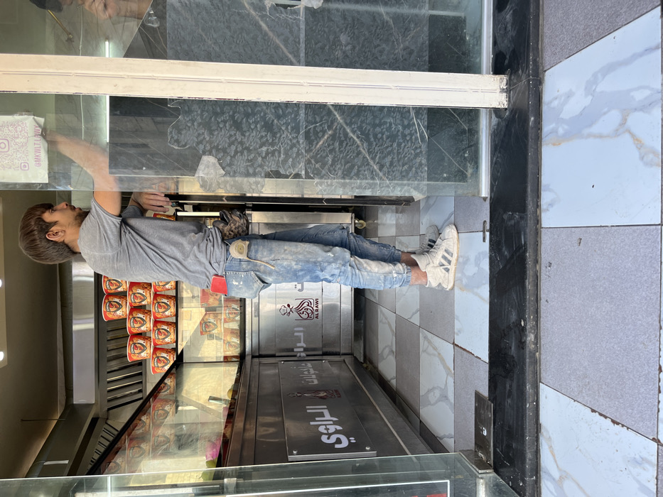 A male individual is depicted standing inside a commercial establishment in Mu'adammiyat ash-Sham, Syria, viewed from an exterior perspective looking inward