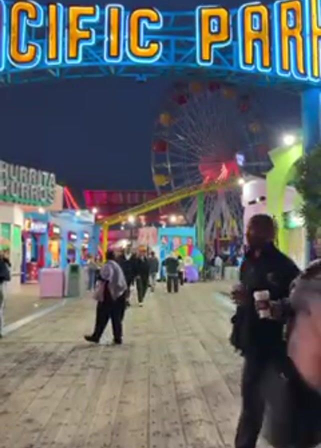 nighttime view of Pacific Park in Santa Monica, California. The iconic Ferris wheel is illuminated with red and white lights in the background. People are walking along the wooden boardwalk, passing under the blue and yellow neon "PACIFIC PARK" sign. There are food stands and carnival games visible on either side of the boardwalk. A woman momentarily walks directly towards the camera while holding a cup.