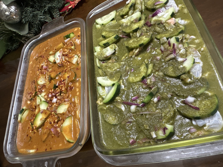Two glass dishes hold contrasting ceviche variations. The left dish contains a reddish-orange broth speckled with red pepper flakes, diced onion, and sliced cucumber. The right dish presents a green-hued ceviche with sliced cucumbers and diced red onions resting atop a murky green sauce. Shrimp can be seen interspersed throughout the green ceviche. The dishes sit on a wooden surface with holiday greenery nearby.