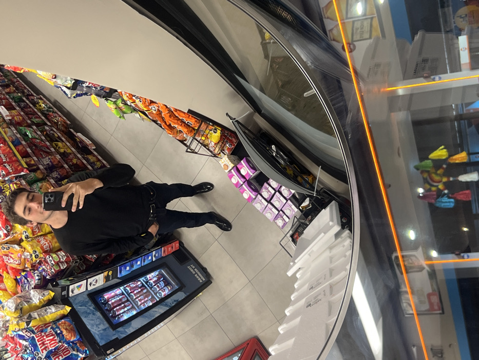 A man in a black shirt and dark pants is reflected in a curved store window. He's holding a phone and taking a selfie. Shelves packed with snack foods, like chips and candy, are visible. A cooler with drinks sits below him. The reflection shows more shelves and displays. The window has a visible frame and bright orange lights.