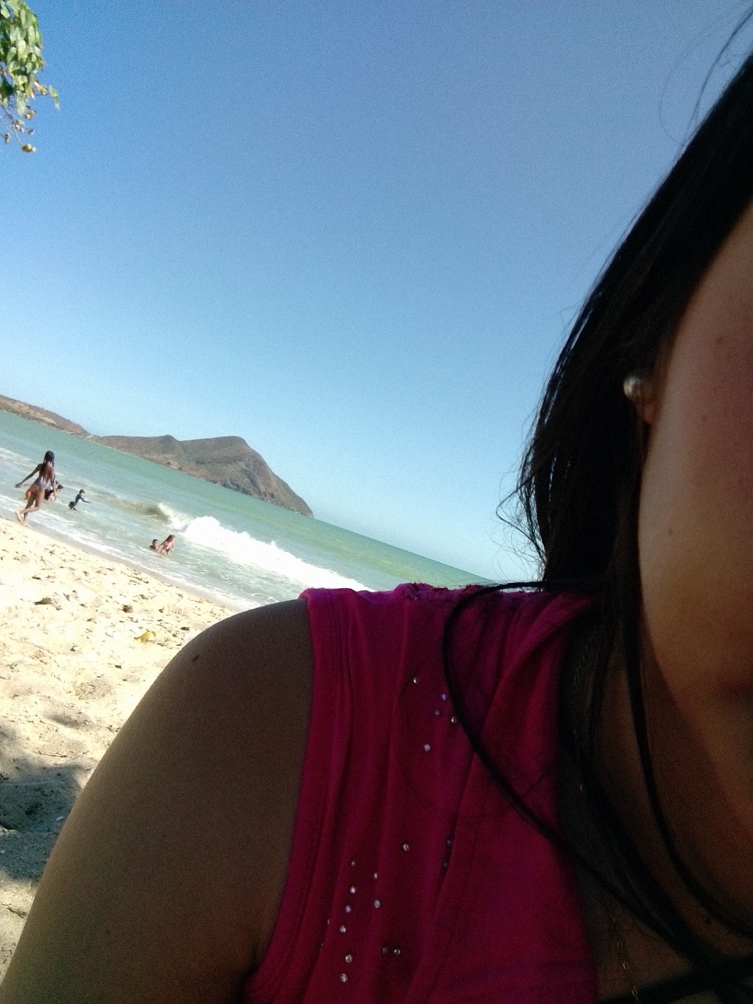 The image captures a beach scene in an unidentified city. In the background, a landmass rises from the water, presumably part of a coastline or an island. The horizon is visible and the sky is clear. Several people are at the beach, engaged in activities such as standing, walking, or swimming in the water. In the foreground, the side of a person's face and shoulder are visible. They are wearing a pink top adorned with small, shiny embellishments.