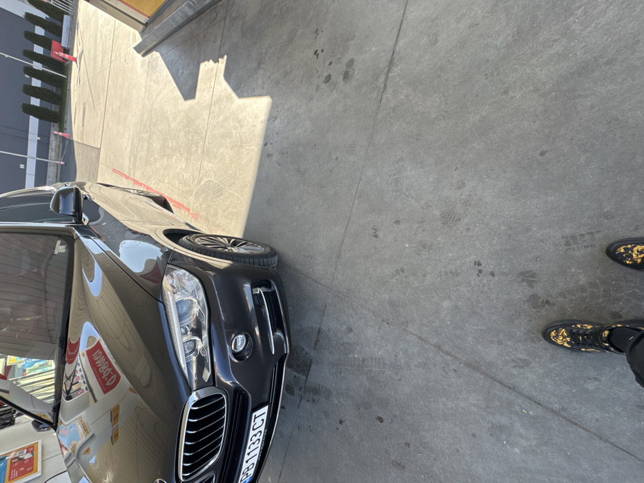The image displays a dark grey BMW X5 SUV, with Bulgarian license plate PB 1133 CT, positioned on a light grey concrete surface. The front section of the vehicle, including its grille, headlights, front bumper, and part of the front passenger-side wheel, is visible. Reflections of an overhead structure and a red and yellow logo, consistent with a Shell fuel station, are present on the vehicle's hood. A red line is painted on the concrete alongside the vehicle's right side. In the immediate foreground, the feet of one individual are visible, clad in black sneakers with distinct gold patterning. The concrete ground is marked with various stains, tire impressions, and minor debris. In the background, beyond the vehicle, a dark grey building facade is visible, accompanied by a row of small, conical green plants and several red pylons. A yellow and red structure, indicative of a fuel pump, is partially seen on the far right. The scene is illuminated by direct sunlight, casting sharp shadows across the pavement. This outdoor commercial environment, consistent with a fuel station, is located in the city of Kardzhali, Bulgaria.