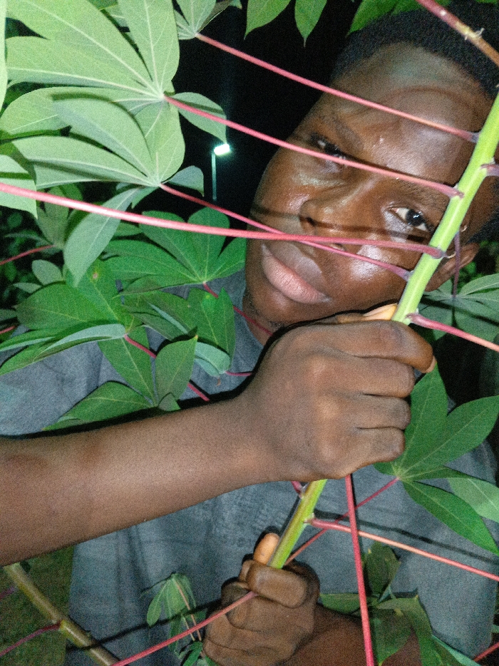 A person with brown skin peers through the leaves and stems of a green plant. The person's face is partially obscured, but one eye and a smile are visible. Both hands are gripping a thick, green stem. The plant's leaves are lush and have a distinctive palmate shape with red veins. In the background, a dim light source can be seen, suggesting an outdoor setting at dusk or night.