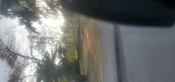 A sunlit park view through a car window. Trees with bare branches and green foliage line the edge of a grassy field. A dark object is visible at the top of the frame, possibly the interior of the vehicle. The scene has bright, diffused lighting, suggesting early morning or late afternoon. The right side of the frame is filled with a grey surface, obscuring part of the view.