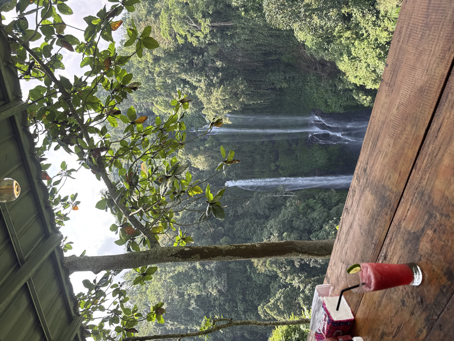 A view from a rustic wooden table overlooking a lush, green forest and a multi-tiered waterfall