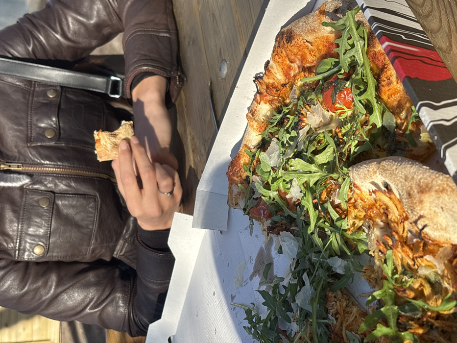 The scene depicts an individual consuming pizza outdoors at an unidentified dining area in Copenhagen, Denmark, under bright sunlight