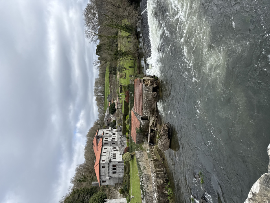 The image presents an elevated view of a riverine landscape in A Ponte Maceira, Spain, under a heavily overcast sky. A dark-bodied river flows from the middle right towards the lower left, characterized by turbulent white rapids and a visible weir or dam structure on the far right. Two single-story stone buildings with reddish-orange tiled roofs are positioned on the river's left bank at water level, appearing to be old mills, with one exhibiting partial structural decay near the water. A large, moss-covered boulder rests within the river, positioned centrally. Further up the left bank, a multi-story stone manor house with a prominent reddish-orange tiled roof is situated on a landscaped elevation. This building features numerous windows and is surrounded by manicured lawns, stone retaining walls, and structured hedges. In the background, rolling hills covered with a mix of bare deciduous trees and some evergreen foliage extend under the gray sky. No individuals or active subjects are present in the scene.
