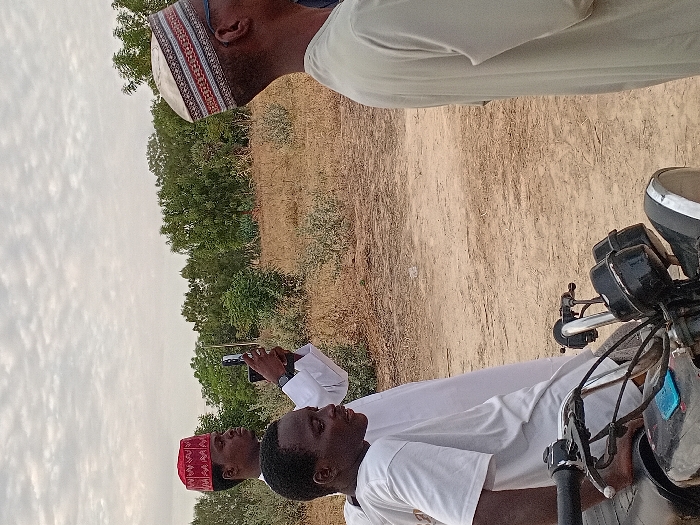 Three men are outdoors, one with a red patterned hat, one with a white cap, and one whose head is partially visible at the top. Two men are facing forward. The man with the red hat is holding what appears to be a smartphone. A motorcycle front is also visible. In the background, there is vegetation and a dirt road.