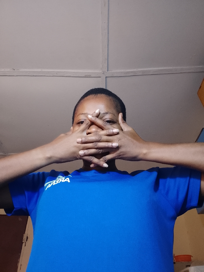 An individual with dark skin and short, dark hair is depicted from the chest up, positioned centrally in the frame. They are wearing a short-sleeved blue t-shirt with white lettering, partially visible as "A...ENA," on the left chest. Both hands are raised, with fingers interlocked, covering the individual's mouth and nose. The eyes are partially visible above the hands and are directed towards the camera. The background consists of a light beige or off-white ceiling featuring a grid pattern formed by visible wooden beams or battens. To the far left, a dark vertical rectangular object, possibly a door frame, is partially visible. To the far right, a small portion of an orange or brown object is visible. The scene is illuminated by what appears to be ambient indoor light. The location is an indoor setting in Unknown, Unknown.