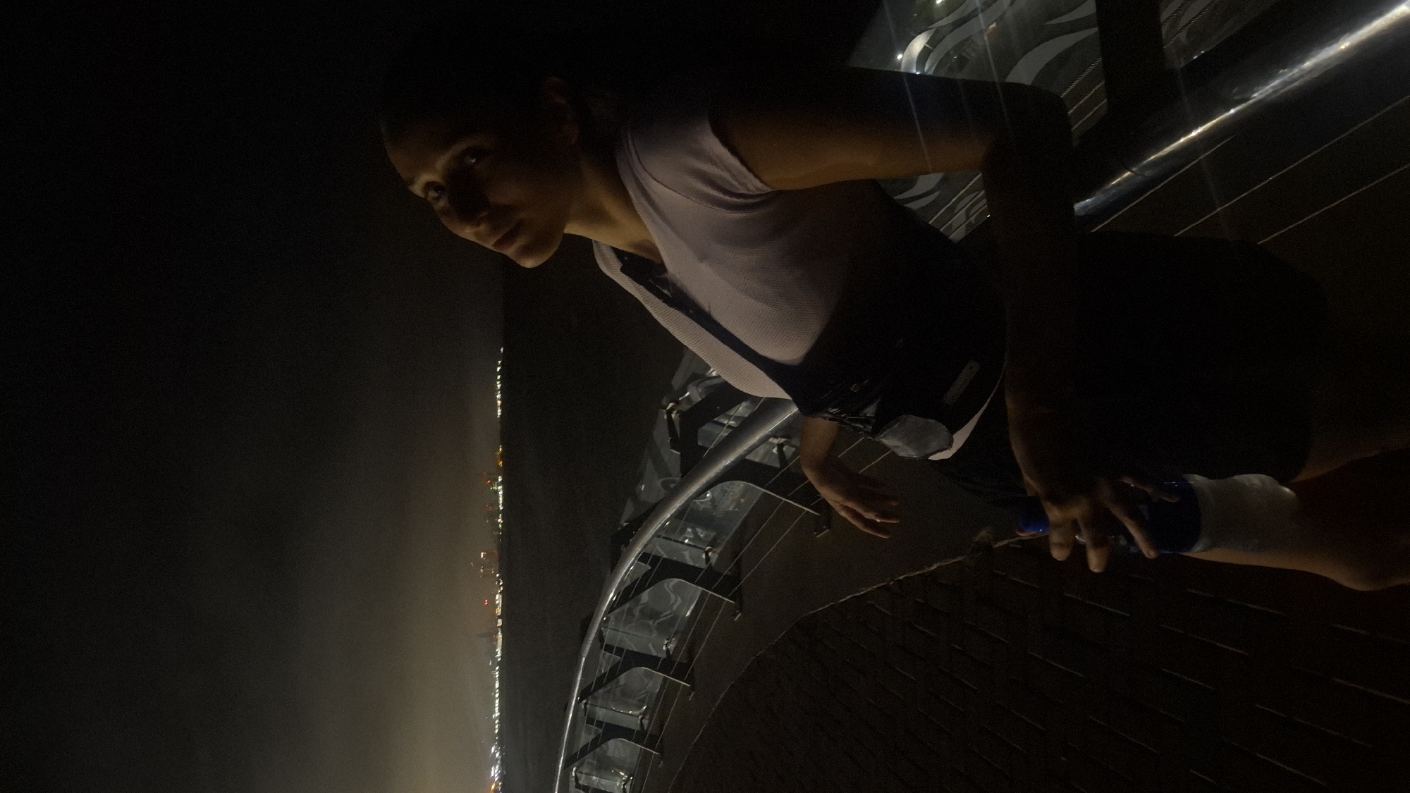 The image depicts a woman standing on a high structure, possibly a bridge or observation deck, in Villa Domínico, Argentina. She is leaning over a railing, with a cityscape visible in the distance. She appears to be holding a water bottle. The overall lighting is dim, suggesting it is nighttime.