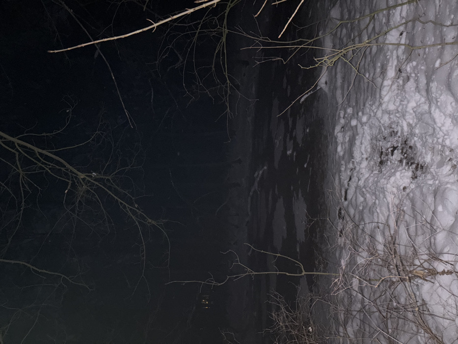 A dark image shows a frozen body of water with bare branches in the foreground