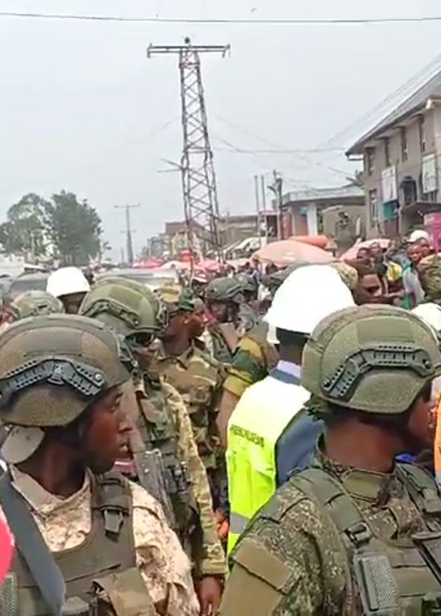 crowd of people in an urban area. Many are wearing white hard hats and some are in camouflage uniforms with helmets. Several of those in uniform appear to be armed. There are also people in suits and some in high-visibility vests. In the background, there are buildings, a utility pole, and a few parked vehicles. The crowd appears to be moving slowly, possibly following someone. The weather looks overcast.