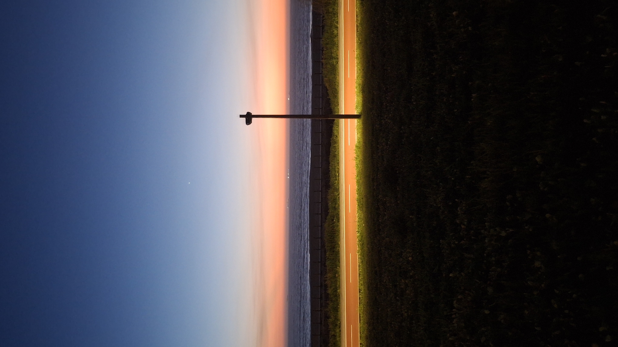 The scene depicts a coastal environment in Vila Nova de Gaia, Portugal, at twilight. The lower third of the image shows dark, dimly lit grass. Above this, a bright, artificially illuminated orange-yellow paved path, possibly a bike lane or pedestrian walkway, traverses horizontally, featuring two short white dashed lines indicating lanes. A slender, dark pole with a small crossbar at its apex stands upright, slightly right of center, casting a shadow and interrupting the path and foreground grass. Beyond the path, a strip of dark, unidentifiable vegetation borders a low, dark barrier. The upper half of the image features the Atlantic Ocean, displaying dark blue water with subtle ripples, and multiple small, distant lights from vessels visible on the horizon. The sky exhibits a gradient, transitioning from a warm orange-pink directly above the horizon to a lighter blue, then darkening to a deep blue overhead. A single, distinct bright point of light, likely a star or planet, is visible in the upper left quadrant of the sky. No individuals, animals, or explicit actions are present.