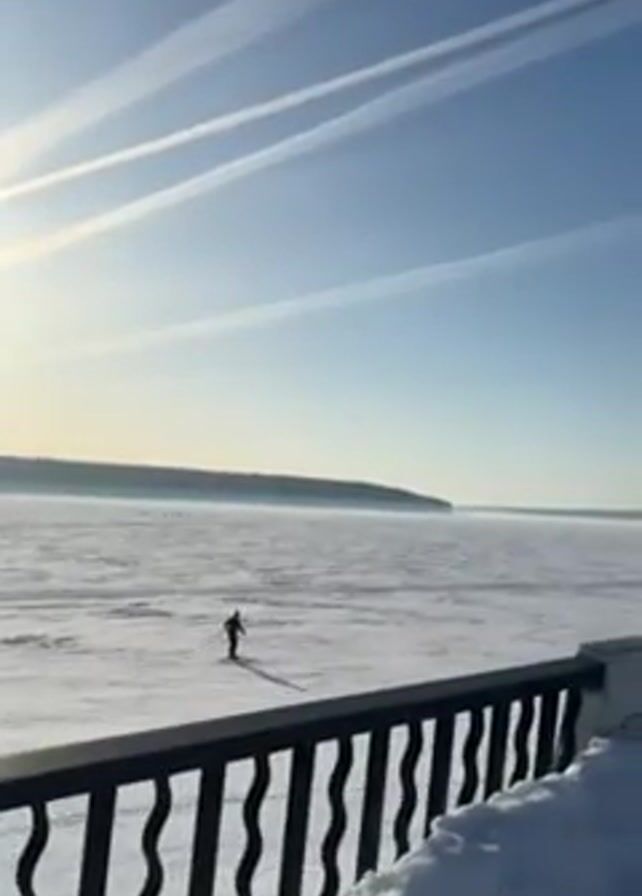 wide view of a person cross-country skiing on a frozen, snow-covered lake or body of water under a bright, clear, blue sky. There are visible contrails in the sky. The person is wearing dark clothing, with a pop of red, and is using ski poles to propel themselves forward. They are moving away from the viewer towards a distant treeline on the opposite shore. In the foreground, there is a black, wavy railing covered in snow. The sun is shining, casting a shadow of the skier on the ice.