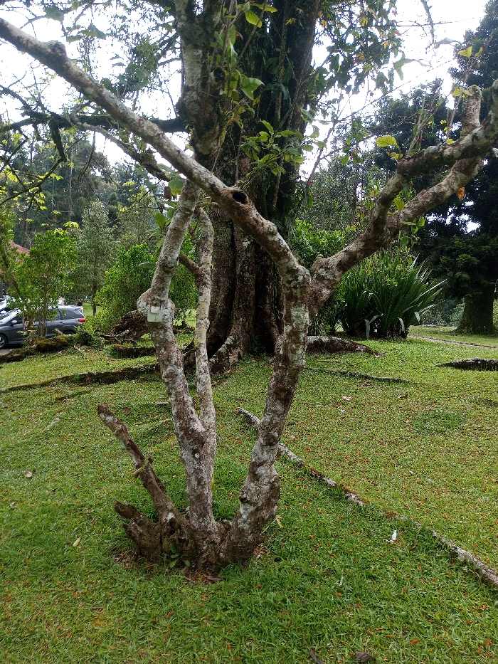 The image captures a static outdoor scene in a park or garden environment within Pachmarhi, India. In the foreground, a multi-trunked, gnarled tree or large bush with mottled grey and white bark, exhibiting bare branches and sparse green leaves, stands rooted in short, vibrant green grass. A small, rectangular white object is affixed to one of its branches. Behind this, a significantly larger tree with a thick, dark trunk and prominent surface roots extends across the grassy terrain, contributing to the dense green foliage that fills the midground. To the left, several light-colored vehicles are parked on an unseen paved surface, partially obscured by intervening vegetation. The background features a mix of broadleaf and coniferous trees, along with other tall, leafy plants, under what appears to be an overcast or bright diffused sky. No individuals, animals, or explicit actions are visible within the frame.