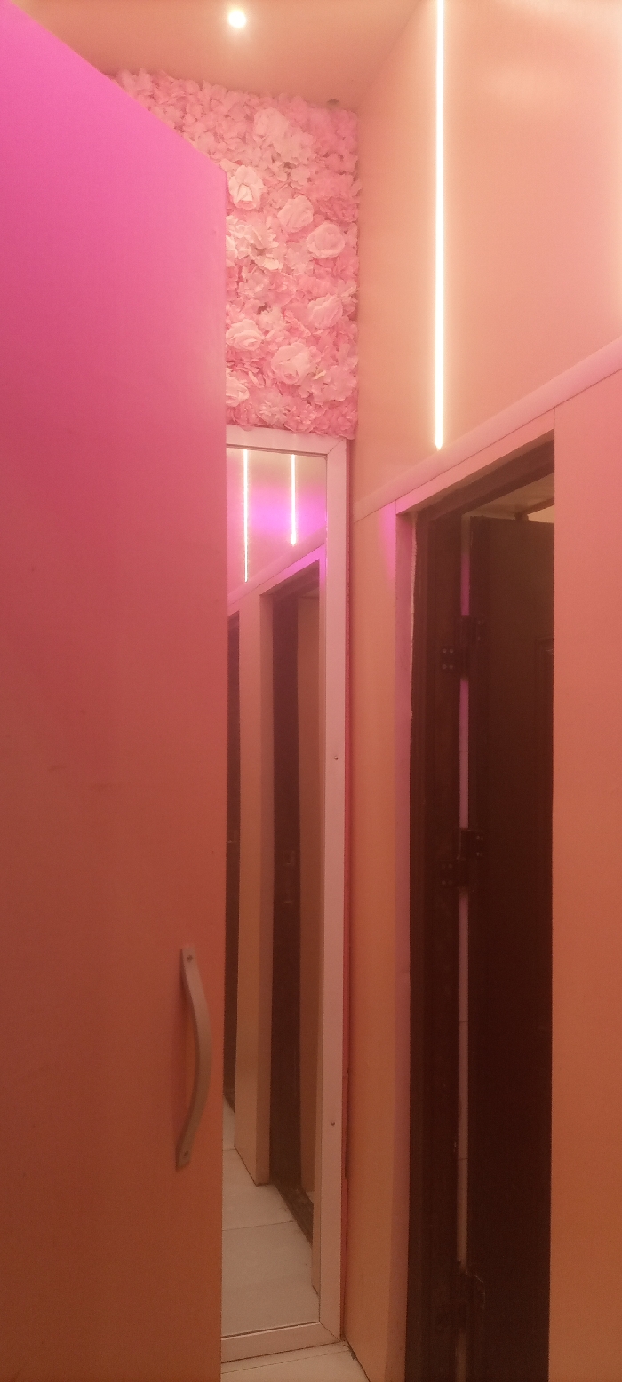 A corridor with pink-peach walls features an arrangement of doors and decor. One door, a solid pink, has a simple silver handle. Adjacent to it, a mirrored frame reflects the corridor's perspective. Further down, a dark door stands slightly ajar. Above, a patch of white flowers adorns the wall's corner, while a vertical strip of light enhances the ambiance.