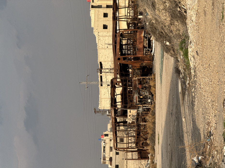 remains of a bus, completely burned out and stripped of its interior, in the city of Sbeneh, Syria. The bus is positioned on a dirt road, adjacent to a multi-story building with visible bullet holes. The bus is facing the building, with its front end partially obscured by the building's structure. The skeletal remains of the bus, composed of rusted metal frames, are visible in the foreground. Power lines stretch across the sky, contributing to a sense of desolation. The scene is captured in a clear, overcast sky, with no human figures present. The debris surrounding the bus suggests a past event, possibly a violent conflict, leaving behind a scene of destruction.