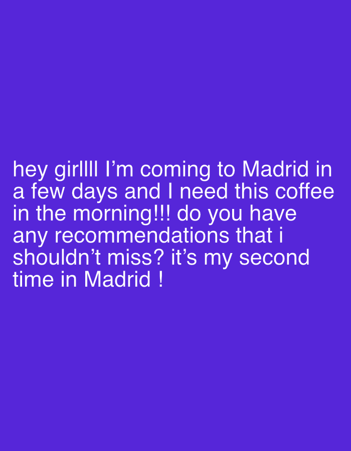 A digital graphic features a solid purple background. White sans-serif text is centrally located in the lower portion, reading: 'hey girllll I'm coming to Madrid in a few days and I need this coffee in the morning!!! do you have any recommendations that i shouldn't miss? it's my second time in Madrid !'. This image contains no visual representation of a physical environment, individuals, or objects other than the text and background. Consequently, no specific location within the city of Bnei Brak, Israel, is depicted or identifiable from its content.