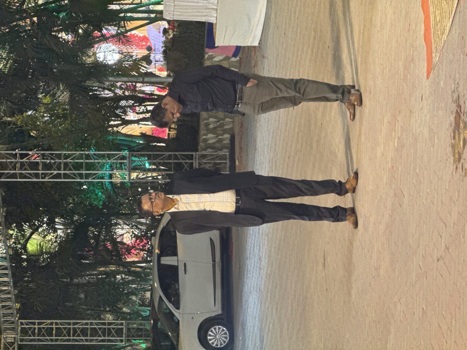Two men stand on a paved surface in front of a white car and ornate structures. The man on the left wears a suit jacket and trousers with a checkered shirt. The man on the right wears a button-down shirt and khaki trousers. Both men wear glasses and brown shoes. The backdrop features trees, metal structures, and colorful decorations.