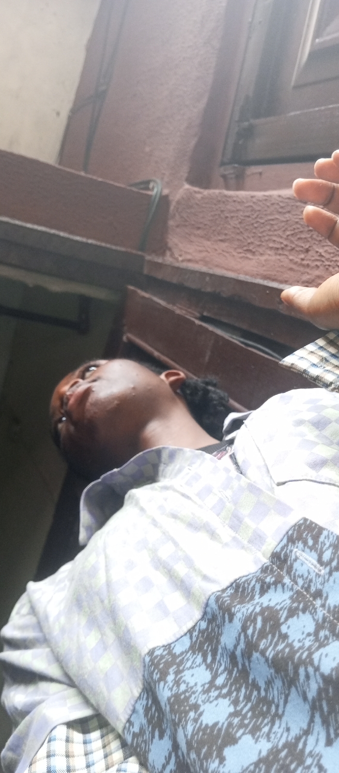 A dark-skinned individual is depicted lying on their back, viewed from a low angle, gazing upwards and slightly to the left. The person has short, dark, tightly curled hair and is wearing a multi-patterned long-sleeved shirt. The upper portion of the shirt features a light-colored (pale blue/green and white) checkered pattern, while a section on the lower torso displays an abstract blue and dark brown/black mottled design. A third plaid pattern is visible near the bottom of the frame. The individual's eyes are open, and their mouth is slightly ajar. To the right of the frame, an adult hand with light brown skin is visible, fingers slightly splayed. The background consists of architectural elements: a textured reddish-brown wall or surface on the right and top, contrasted with a lighter, possibly cream-colored wall on the upper left. Dark horizontal beams or frames, possibly part of a window structure, are present. Dark electrical wires or cables run along these structural elements. The setting appears to be indoors or within a covered outdoor space. The scene is observed in Abuja, Nigeria.