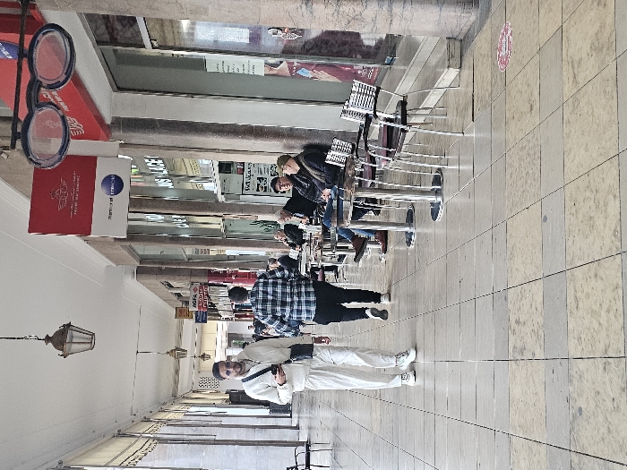 A daytime scene depicts a covered pedestrian arcade with shops and cafes lining the right side. The location is an unknown city, in an unknown region. **People:** Six adult males are visible. 1. A man in the foreground walks towards the viewer, dressed in a white hoodie, white pants, and white sneakers, holding a black smartphone, and carrying a black shoulder bag. He wears dark sunglasses and has a beard. 2. A second man walks away from the viewer in the midground, wearing a blue and white plaid shirt, dark pants, and white sneakers. 3. Four men are seated at two small, round cafe tables on the right. They appear to be conversing. Two men sit at the closer table; one wears a dark jacket, blue jeans, and brown shoes, while the other wears a dark jacket and dark pants. Two men sit at the further table; one wears a dark jacket and a dark cap, the other a dark jacket. **Objects and Environment:** The arcade features a floor paved with light-colored rectangular tiles. A series of light-colored, ornate pillars line the left side, extending into the background. Overhead, multiple antique-style brass or bronze lamps hang from the ceiling. On the right, multiple storefronts are visible behind large glass windows. Signs include: * A prominent red rectangular sign displaying a golden crown-like emblem, Arabic script, and "POSTE MAROC" (Moroccan Post). Below it, a blue sign with "manitoba" (or similar text). * Further down, a partial sign for "AGFA". * A partially visible cafe sign that reads "S PLACE". * An oversized eyeglasses-shaped sign hangs above the rightmost visible shop. Several empty cafe tables with shiny silver pedestals and chairs with black seats and silver frames are arranged along the right side. A lone black metal chair is on the far left. A red circular floor sticker, possibly a social distancing marker, is on the floor near the rightmost shopfront.