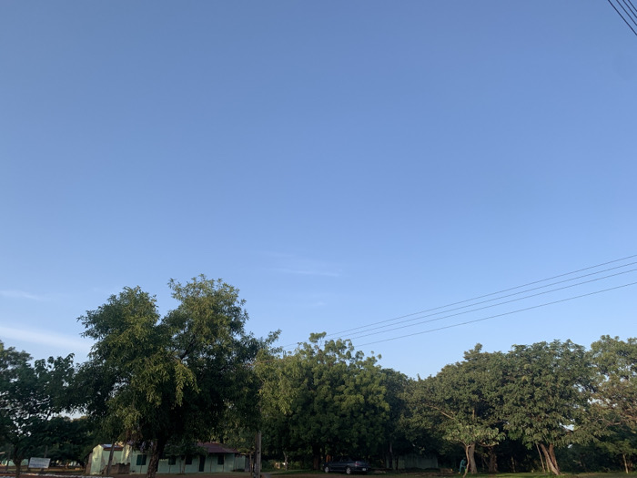 The image depicts an outdoor daytime scene in Kubi A, Nigeria, characterized by a clear blue sky occupying the upper two-thirds of the frame. A dense line of green deciduous trees with full foliage spans the lower third. Partially visible behind the trees on the left are single-story structures with light green walls and darker roofs. A dark-colored sedan is parked behind trees in the mid-left portion. On the far right, one individual in a light-colored shirt is visible standing near the base of a tree. Several utility wires traverse the mid-right sky horizontally above the treeline.