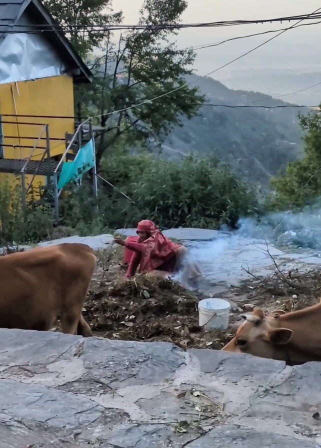 woman sitting next to a small fire with two cows nearby. The woman is wearing a red headscarf and a long-sleeved red shirt. She is sitting on the ground next to a pile of dirt, sticks, and leaves. Smoke is rising from a small fire in front of her. There is a white bucket sitting near the fire. Two brown cows are visible in the foreground. One cow is standing on the left side of the frame, while the other is lying down on the right side. The cows are close to the woman and the fire. In the background, there is a small, yellow and blue building with a metal roof and a set of stairs leading up to it. There are also trees and a mountain range in the distance. The sky is a light grey color. The scene appears to be set in a rural, mountainous area. The ground in the foreground is made of grey stone tiles. There are some power lines running across the top of the frame.