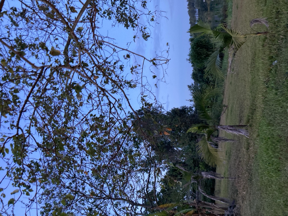 A dusk landscape shows a tree with sparse leaves against a darkening blue sky. Adjacent to it, a line of young palm trees stands on a grassy verge. Further back, denser foliage creates a backdrop, hinting at a forest or hillside. The image is rotated ninety degrees.