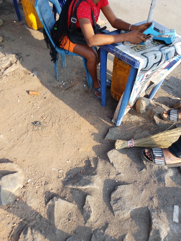 A person with long black braids, dressed in a red shirt and orange shorts, sits on a blue plastic chair behind a blue table, using a mobile phone. A yellow container sits near the chair. The ground is rocky and sandy. A second person's legs, wearing sandals, are visible near a broom on the ground.
