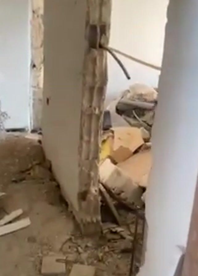 interior of a building undergoing demolition or renovation. The camera moves through a series of rooms connected by partially demolished doorways. The walls are white, with visible damage including exposed brick and wiring. Debris such as cardboard boxes, construction materials, and rubble cover the floors. There are no people visible in the video. The lighting is bright, and the overall impression is one of destruction and disarray.
