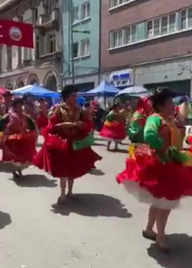A group of women in colorful, festive outfits dance in a street parade