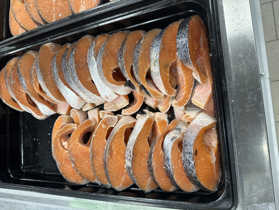 A black tray displays sliced salmon portions