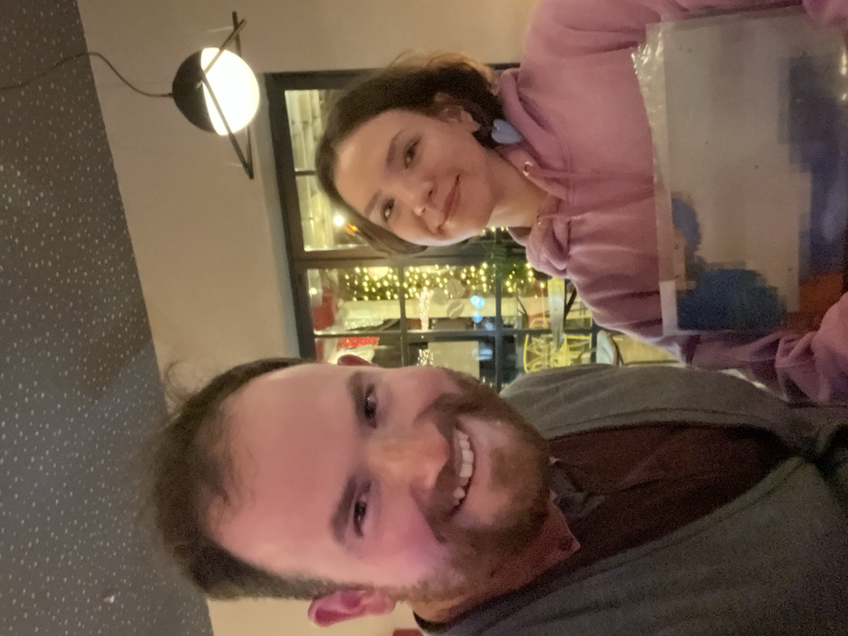 A smiling man with a beard is in the foreground, wearing a gray sweater. Behind him and slightly above is a smiling woman in a pink hoodie with blue earrings. The woman is holding a clear, rectangular object with blue contents. A window is visible behind them, decorated with lights. Above them is a modern light fixture with a round bulb. The interior setting suggests a restaurant or home environment with a decorated background.