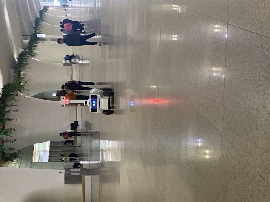 A white robot with a digital screen and red/blue lights navigates a large, polished floor