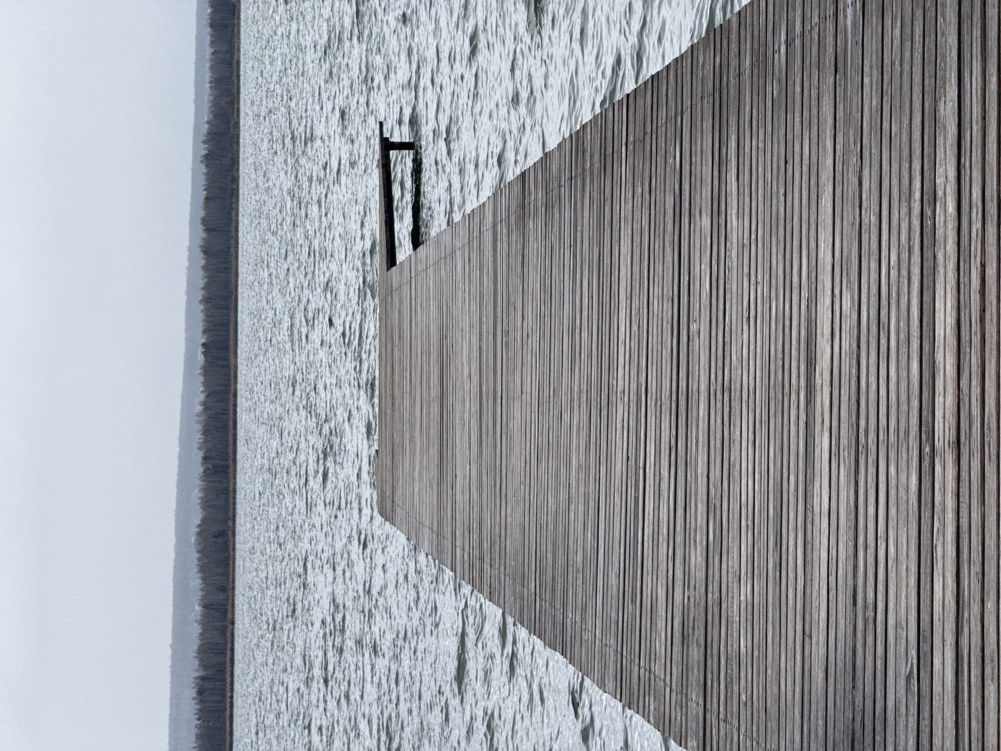The image depicts an elevated wooden structure or platform, possibly a pier or deck, adjacent to a body of water
